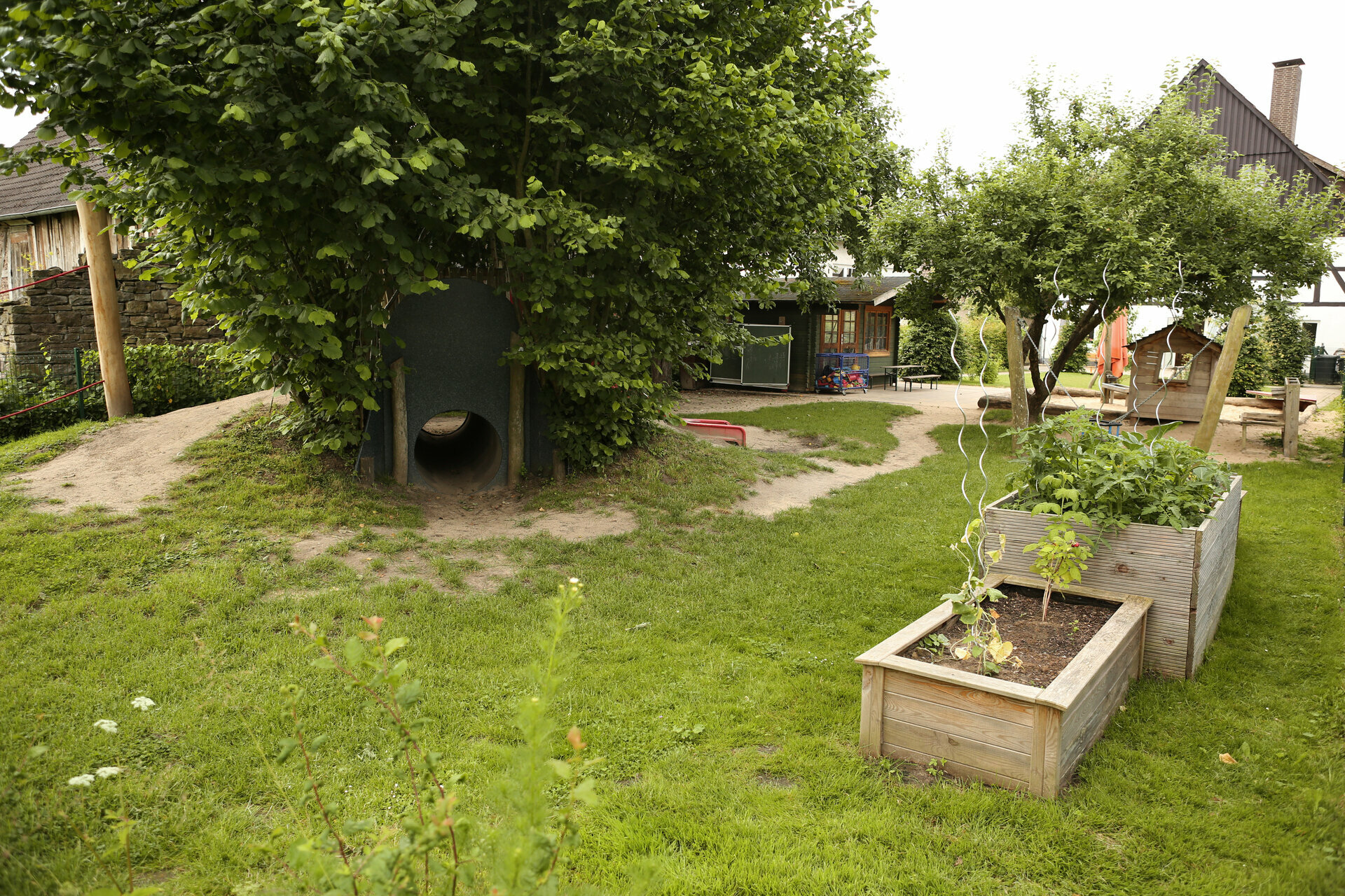 Die Natur bietet viele Erfahrungs- und Erlebnisräume. Kinder bemerken Geräusche und Situationen, die sie sonst selten wahrnehmen: rauschende und “tanzende“ Blätter, emsige Ameisen, leises Vogelgezwitscher oder das Plätschern des Maibachs. Natur in den unterschiedlichsten Farben und Formen, lustige und geheimnisvoll aussehende Baumwurzeln, duftende Blüten, kriechende Kleintiere, sowie vielfältiges Gestrüpp und Hecken.